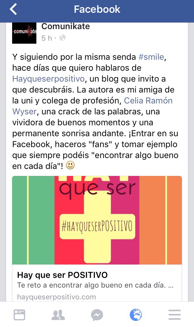Yo pedí un favor el otro día después de pensarlo mucho y pensar si no sería tener mucho morro. Les dije a mis amigos si me hacían el favor de compartir la página de facebook de Hay que ser positivo para aumentar los seguidores, porque me hace ilusión pero es un proyecto personal y no quiero arruinarme a pagar a Facebook por publicidad (todavía). Y… La han compartido sin dramas y con mensajes preciosos que me definen como ellos me ven. Eso sí me ha hecho feliz y me ha sacado una buena sonrisa! Más que los nuevos que seguidores, que también los tengo y me encanta!!!