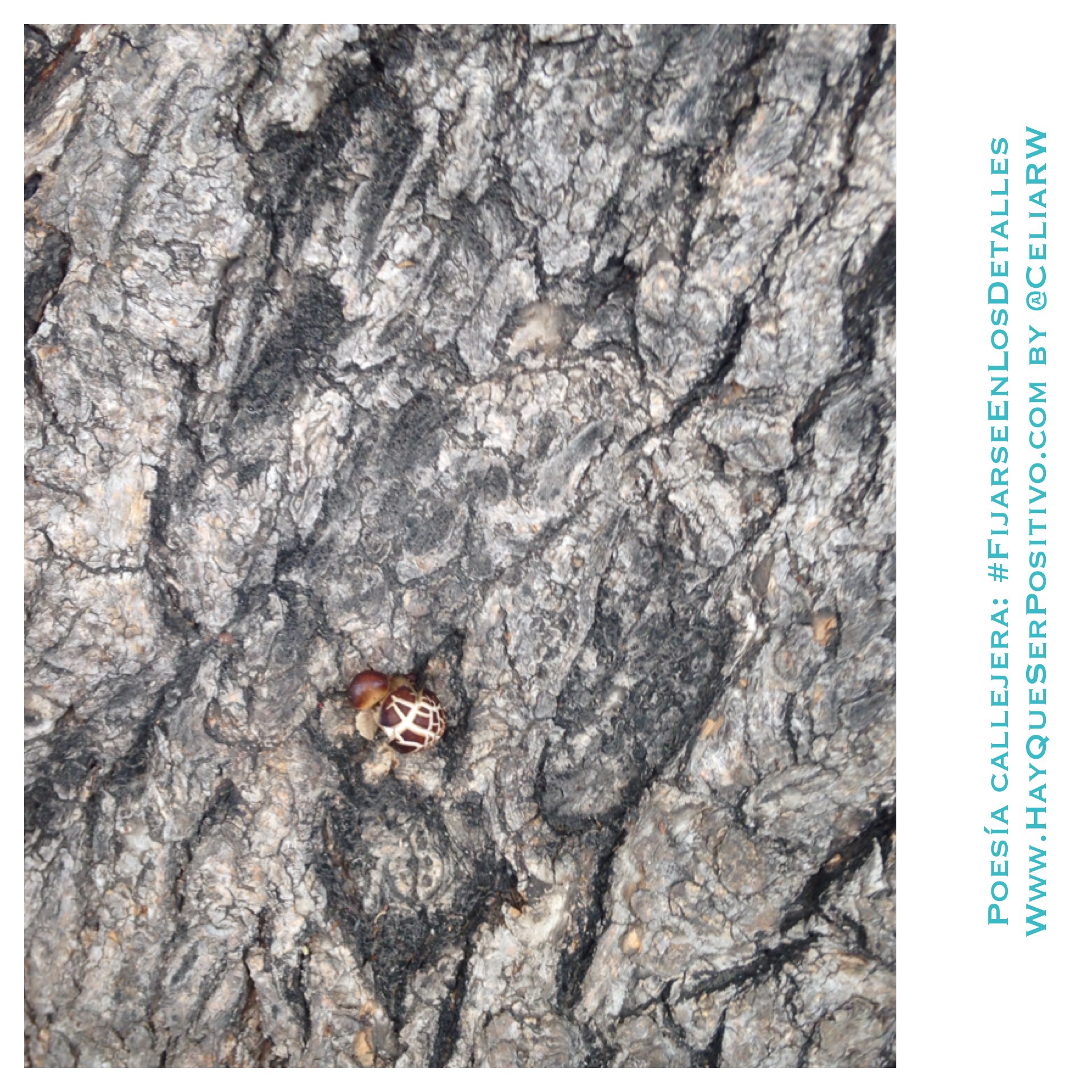 Y para confirmar la teoría, mi hijo Pol, tan listo en esto de disfrutar del momento y de fijarse en todo lo que le rodea disfrutándolo con una pasión que solo tienen los niños, me señala un troncó de árbol emocionado y dice invadido por la alegría: «mira, mamá, mira que tronco más bonito! Tiene hasta champiñones! Hazle una foto para acordarnos!». Qué envidia, la pasión infantil por cualquier detalle. Así que, venga, levanta la mirada del móvil y observa. Déjate invadir por la poesía callejera, deja que te saque una sonrisa, y sigue, con tu día, adelante.