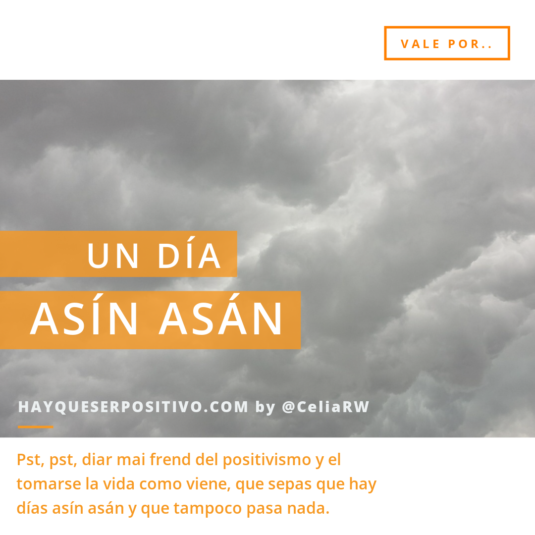 Pst, pst, diar mai frend del positivismo y el tomarse la vida como viene, que sepas que hay días asín asán y que tampoco pasa nada. Que sí, que la cara mustia o la mirada perdida se aceptan por un día. Hasta las ojeras, los silencios o las respuestas un poco -sólo un poco- fuera de tono. Que si no tuvieras nunca un mal día no serias human@, que aceptamos pulpo como animal de compañía por hoy. Y ya si eso mañana ven más asán que asín y regálanos una sonrisa espléndida o una canción viejuna que nos haga reír. Porque mai frend, se te quiere aunque gruñas de vez en cuando.