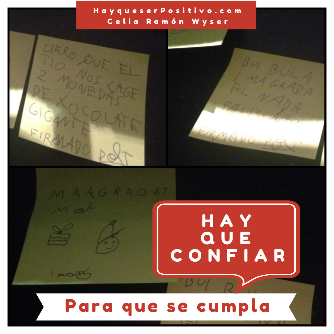 «Confiar. Confiar en que se cumplirá. Ese es el secreto. Tú confía». Se lo dice Pol a su prima que está de visita y no acaba de tener claro que haber escrito un deseo en un post-it después de visitar la exposición de pesebres vaya realmente a hacer que los Tiós «caguen» mañana dos monedas gigantes de chocolate para cada uno. Ella le mira sería y algo escéptica, con esaadultrz que tienen desde niñas las pequeñas. Y mi hijo, desde su ilusión infantil y su seguridad absoluta de niño más inocente se lo repite convencido que sí, que la magia de los deseos existe, que los troncos, alimentados de canciones u pieles de mandarinas escuchan a los niños y que hay que confiar, porque confiar es el secreto de la magia. Tanta fé me enternece. Es una confianza desmedida, un creer que lo mereces, porque eres bueno, de buena gente. Es simple y muy poderoso.