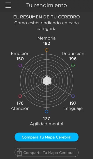 Tras mi primer entrenamiento ha quedado claro que la aplicación quiere que me vuelva asidua a su entrenamiento porque tengo un mapa mental peor que el de un anciano de 70 años. Pero la aplicación me anima con un «tienes mucho margen de mejora» o «lo has hecho mejor que el 56% en esta categoría»… Está bien, estoy griposa, es mi primera vez y supero el 50 y a veces hasta el 70%. Quien no se conforma es porque no quiere. Y sí, me ha picado, voy a conseguir ser por lo menos igual que las mentes de mi edad, hombre ya!!!