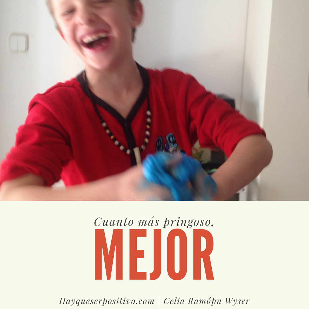 Cuánto más pringoso, mejor: es una ley infantil universal a la que los adultos a veces hacemos ascos (literalmente). Y es una lástima, porque se nos olvida el placer de amasar, estirar, ensuciarnos, pringarnos a algo y dejarnos ensuciar por la vida y nuestros proyectos. A veces intentamos pasar de puntillas, para que el amor o el trabajo o las relaciones no nos manchen, que no duelan, que no afecten… Pero la cosa no funciona así, porque sin ensuciarse tampoco se disfruta del todo. En este miércoles mudo, una imagen del último experimento realizado en casa: una pasta viscosa y vistosa. No hay más que ver la cara de pura felicidad. Y es que, no lo olvides, en la vida, cuánto más pringoso, mejor!