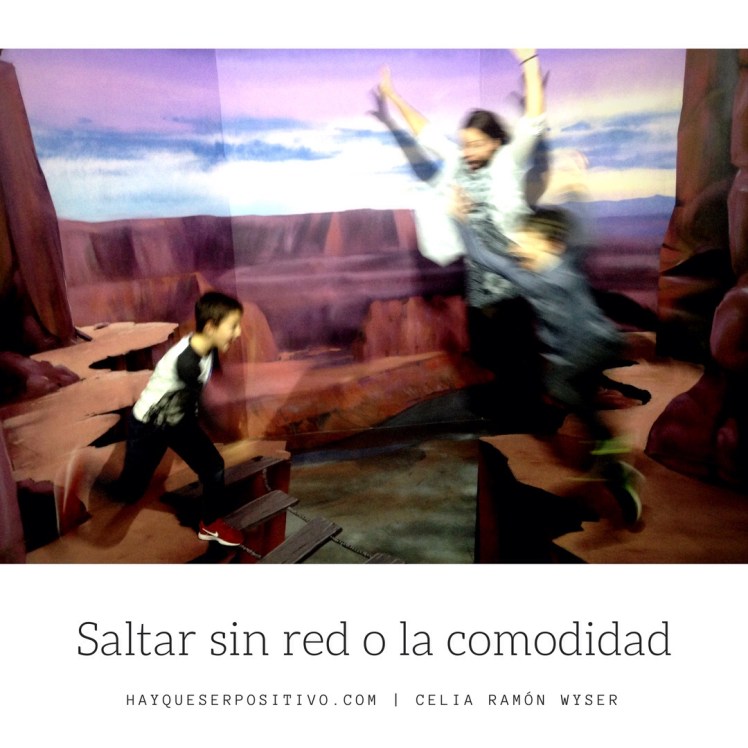 Entiendo los miedos de mis amigas. Es como cuando mi hijo no quiere ir a hablar con el grupo nuevo del parque y me da la mano para que le acompañe. Y le doy la mano y le sonrío para que tome fuerzas, pero luego le suelto la mano y le digo, «ve», porque no, no puedo acompañarle. Puedo mirar en la distancia, cada vez a más distancia. Pero no acompañarle. Porque tiene que aprender a tomar riesgos, a salar sin red, y perseguir sus metas. No hace falta que vaya de kamikaze, eso es de suicidas o de tontos, pero quedarse por comodidad o seguridad, conformarse, solo por eso, no, esa no es una opción de vida, ni con la pareja, ni en el trabajo ni en ningún ámbito.