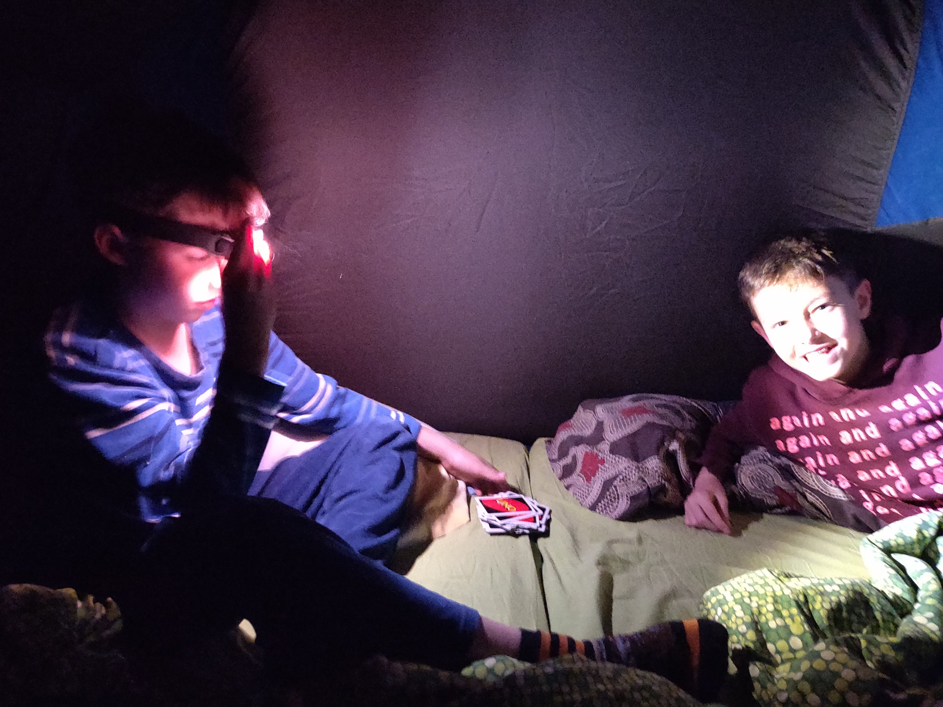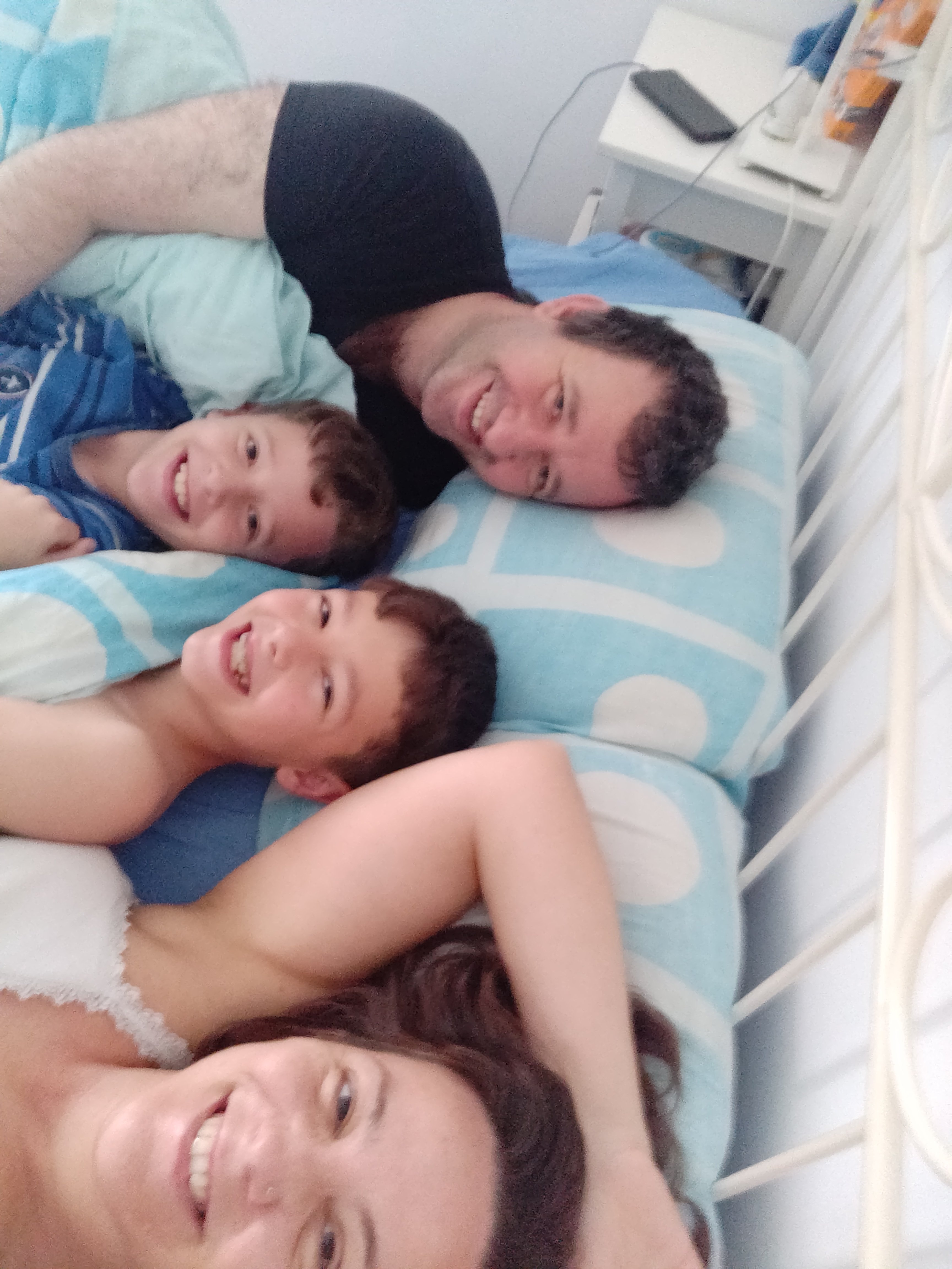 Esta mañana el padre ha tenido que ir a rescatarles de la tienda. Se habían quedado encerrados porque la cremallera estaba encallada por dentro. Han intentado llamar a su abuelo por teléfono a través del Drop In de Alexa para que él a su vez nos llamara a nosotros. Pero no funcionaba: «no hay ningún contacto disponible», decía el altavoz. Y el padre de oído fino se ha despertado y los ha rescatado. Entonces hemos despertado todos juntos en la cama.