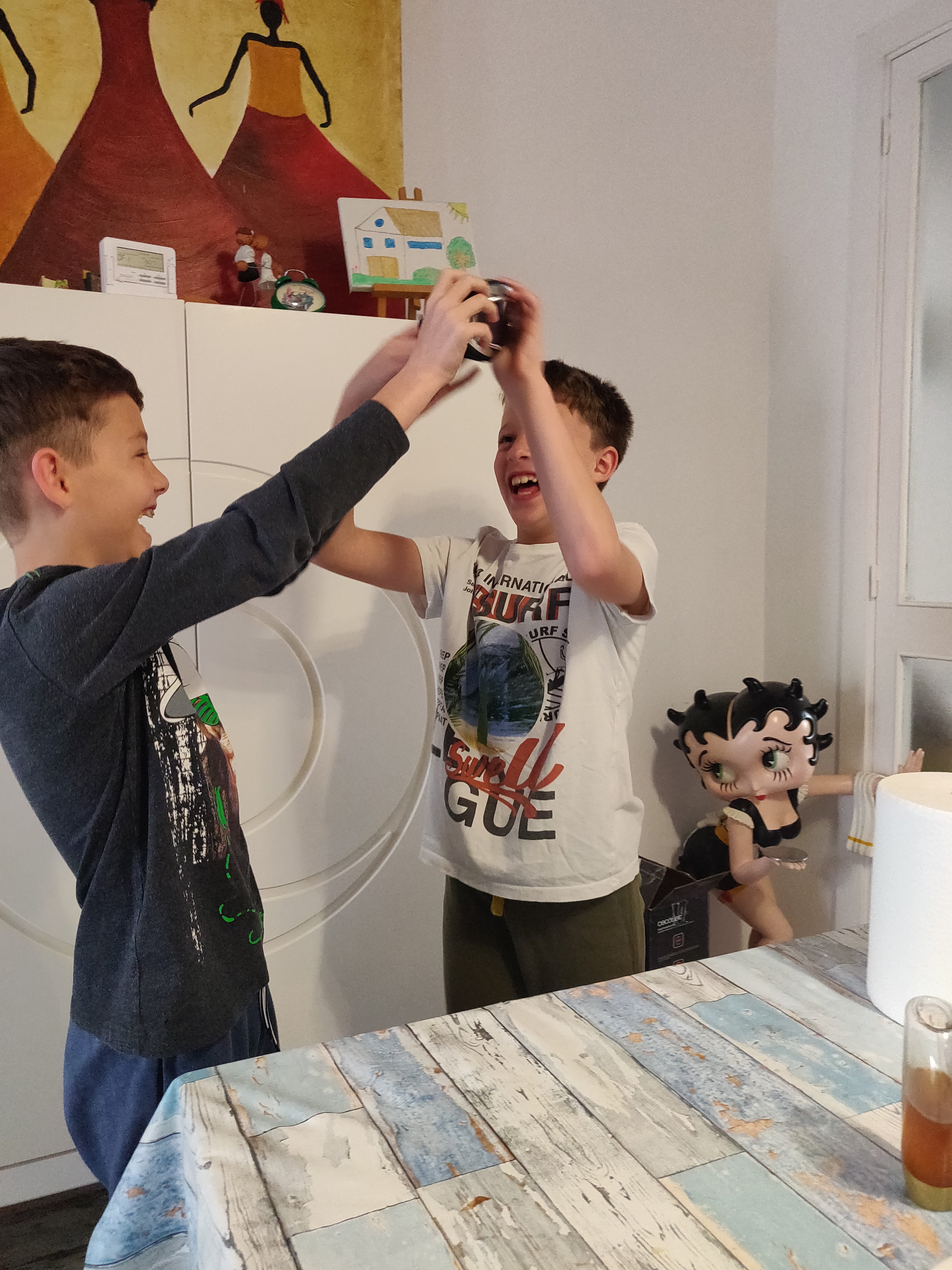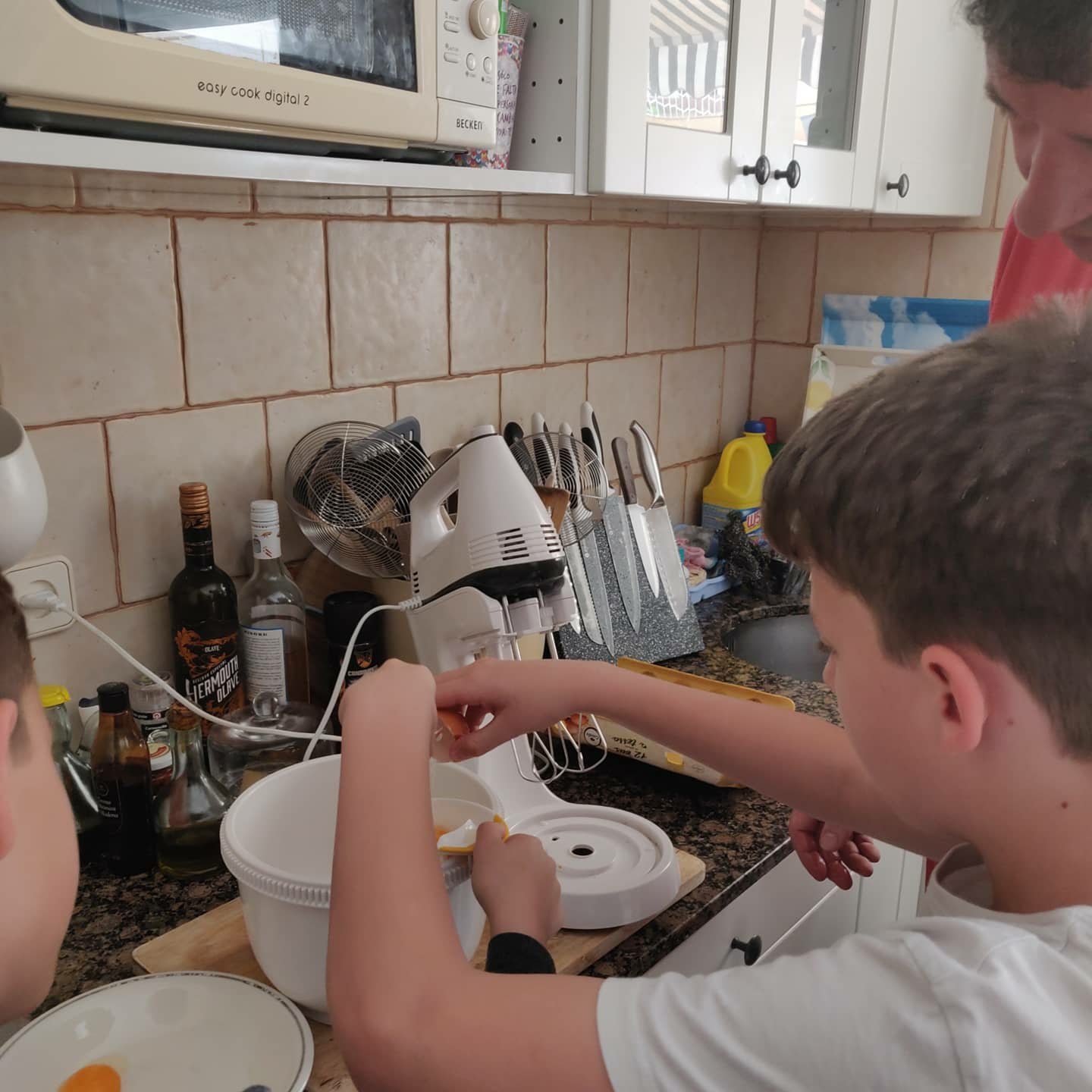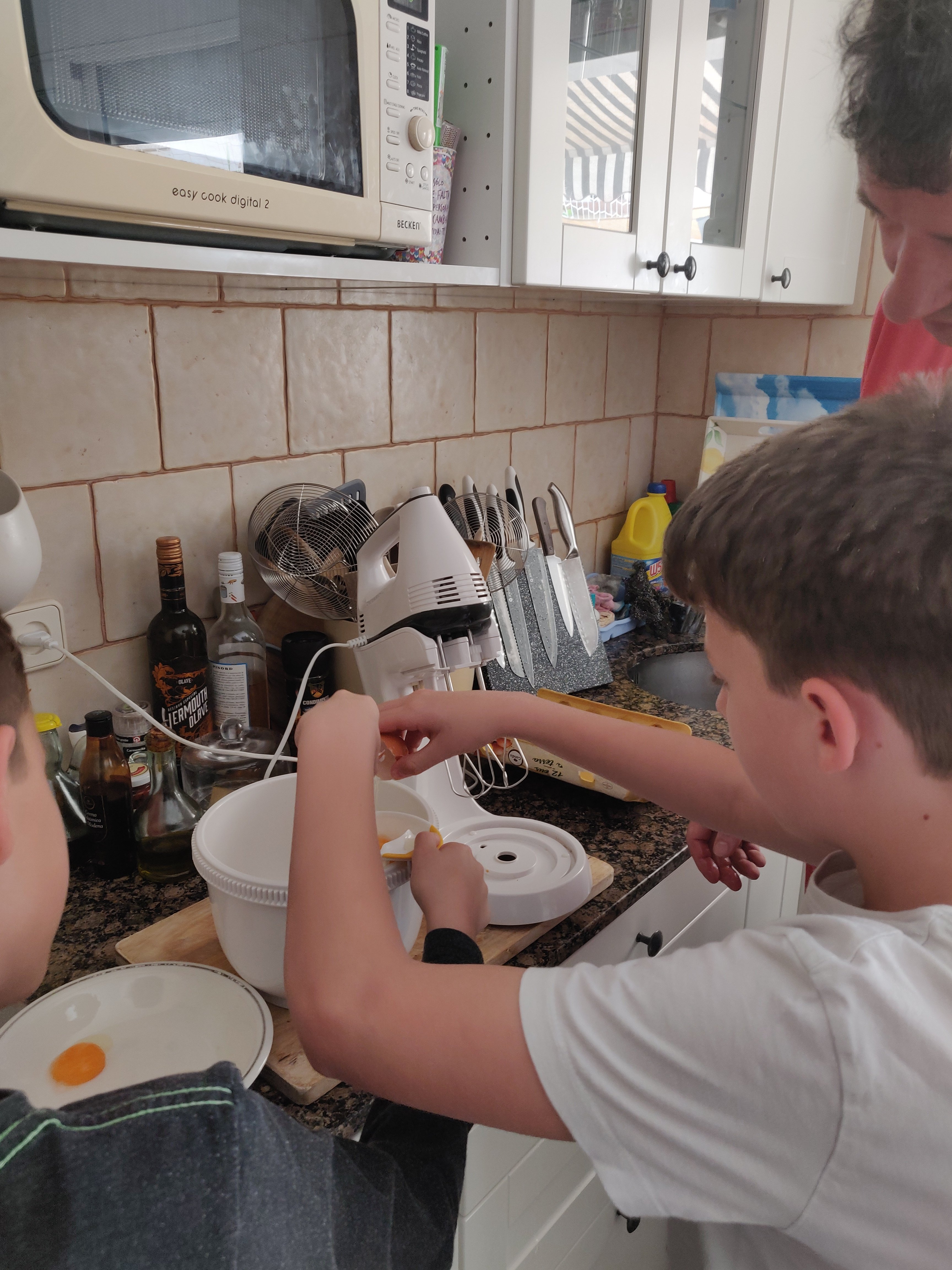 El programa del día es apretado. Gofres de desayuno. Hacer dos pasteles para construir una tarta de 2 pisos con cobertura de fondant (puede ser un desastre, ya veremos). Recibir la visita sorpresa de la guardia urbana que ha felicitado a los niños y les ha entregado un diploma por haber vivido bien el encierro… Y nos queda mucho día: comer lo que ellos quieran, jugar juntos, videollamadas…