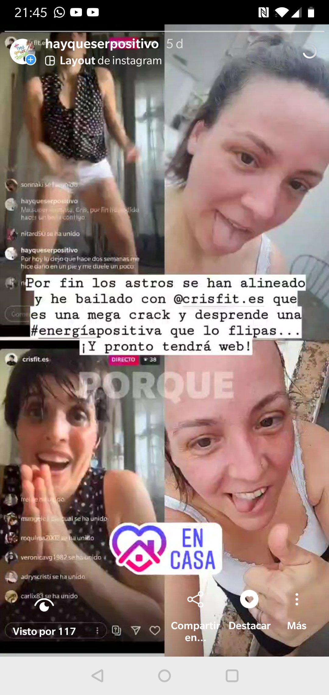 Hoy me he encontrado un ratito con el baile de @crisfit.es. Me convalida por dos fiestas por lo menos. ¡Qué bien sienta bailar y dejar fluir el cuerpo! Notarse, entrar en movimiento, soltar lastre… Nota mental: Creo que tengo que obligarme a encontrarme más… ¿Os encontráis a veces? ¿O tenéis la sensación de no haber aprovechado el tiempo para nada más que para sobrevivir -que no es poco-?