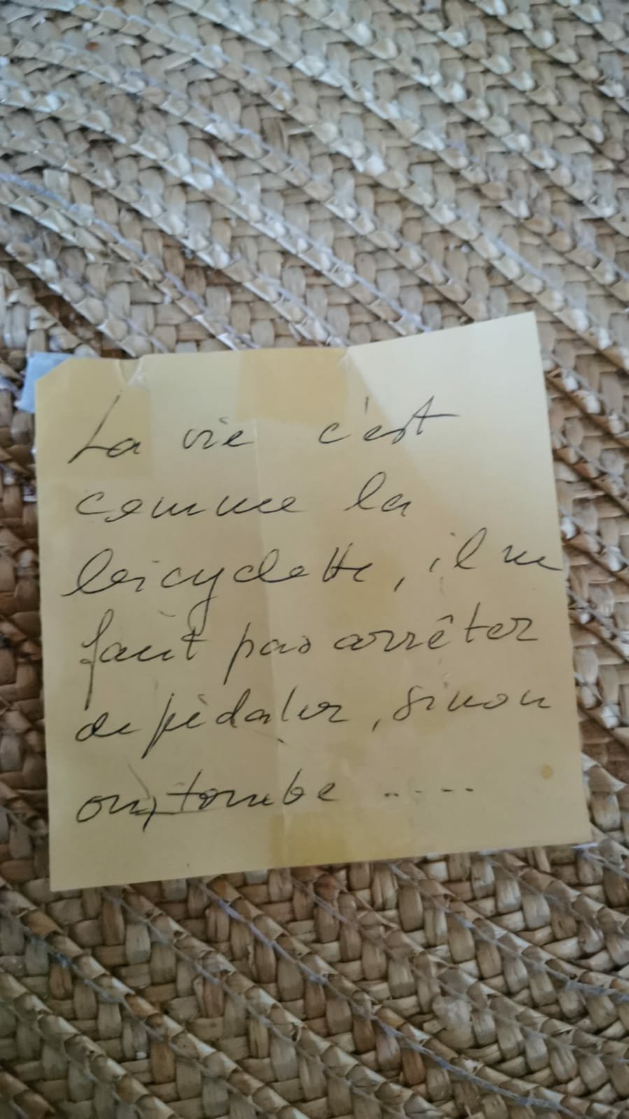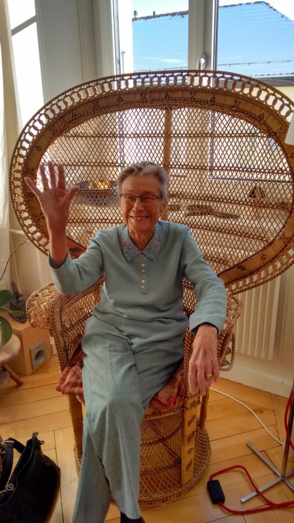 Chère Grand, j’aurais aimé te soutenir. Te dire que nous avons tous bien appris de ta part le dicton que tu avais noté partout dans la maison avec ta calligraphie si belle. Oui, “la vie c’est comme aller en bicyclette, il ne faut pas arrêter de pédaler, sinon on tombe”… Mais maintenant, tu peux laisser aller le pédal, Grand, tu peux voler et rejoindre Grand-papa là-haut vers les étoiles, celles que tu aimais tant regarder les nuits d’été. Repose- toi bien, regarde-nous continuer à aimer la famille telle que tu nous l’as montrée. Donne-nous du courage pour ne pas perdre de vue que l’important ce sont toujours les petits détails: avoir la boîte pleine des biscuits si jamais quelqu’un venait faire un thé, garder des cadeaux en réserve dans un coffre pour les anniversaires et les fêtes de Noel, noter tout ce qui arrive d’important dans les vies de ceux que tu aimes, faire des photos, par centaines, et surtout ne pas oublier de les imprimer et les organiser dans des albums photos qui sont notre bible particulière.