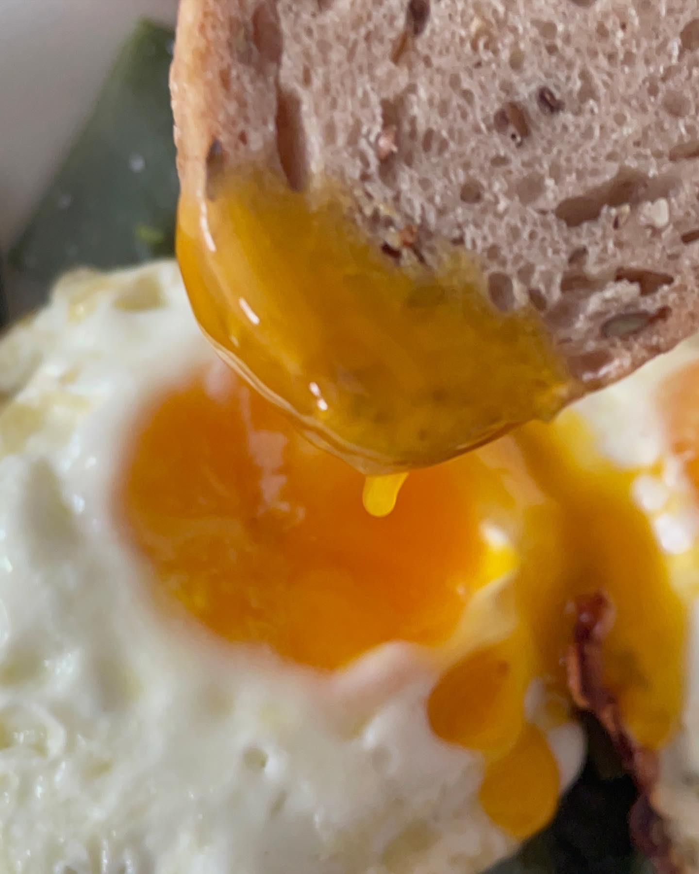 Cosas pequeñas que me hacen feliz: comer un huevo frito mojando pan (sin gluten) mientras tus hijos juegan en la calle. Y reír, aunque sea de mí misma.